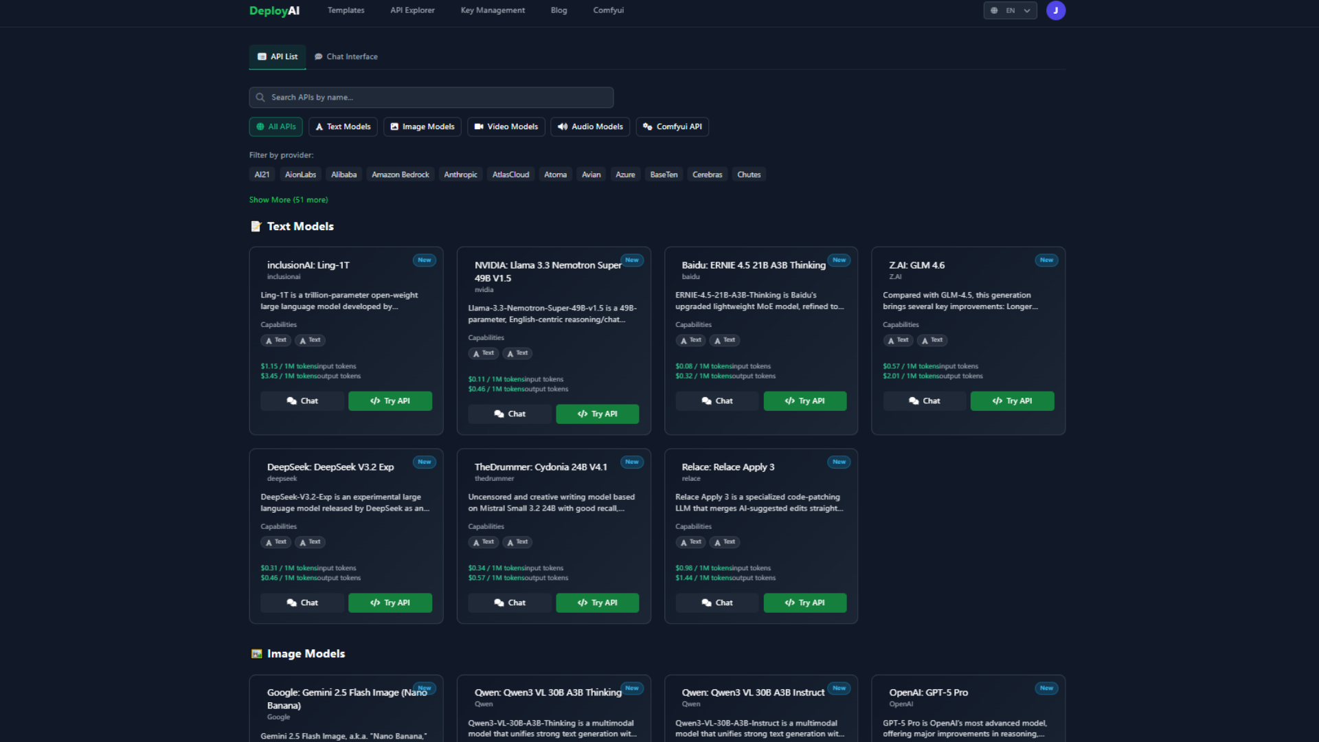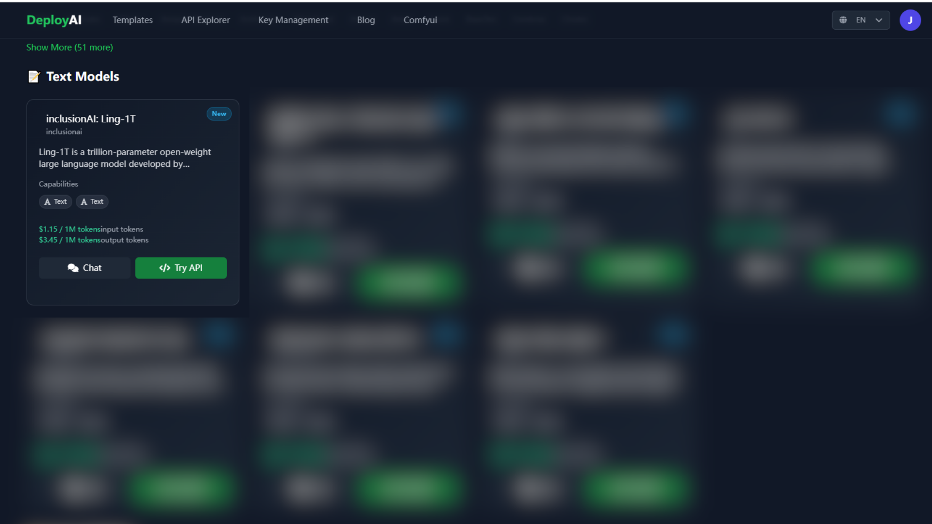 Ling-1T supports a 128K context window, allowing it to read and comprehend book-length content in one go without losing track.This makes it extremely valuable for tasks involving legal documents, financial reports, and scientific papers.If you’re interested in Ling-1T, visit DepolyAI to try it out.On DepolyAI, you can not only access the latest large models but also explore ComfyUI cloud services for generating AI-powered images, videos, and audio — all without VPNs, accessible from both computer and mobile.