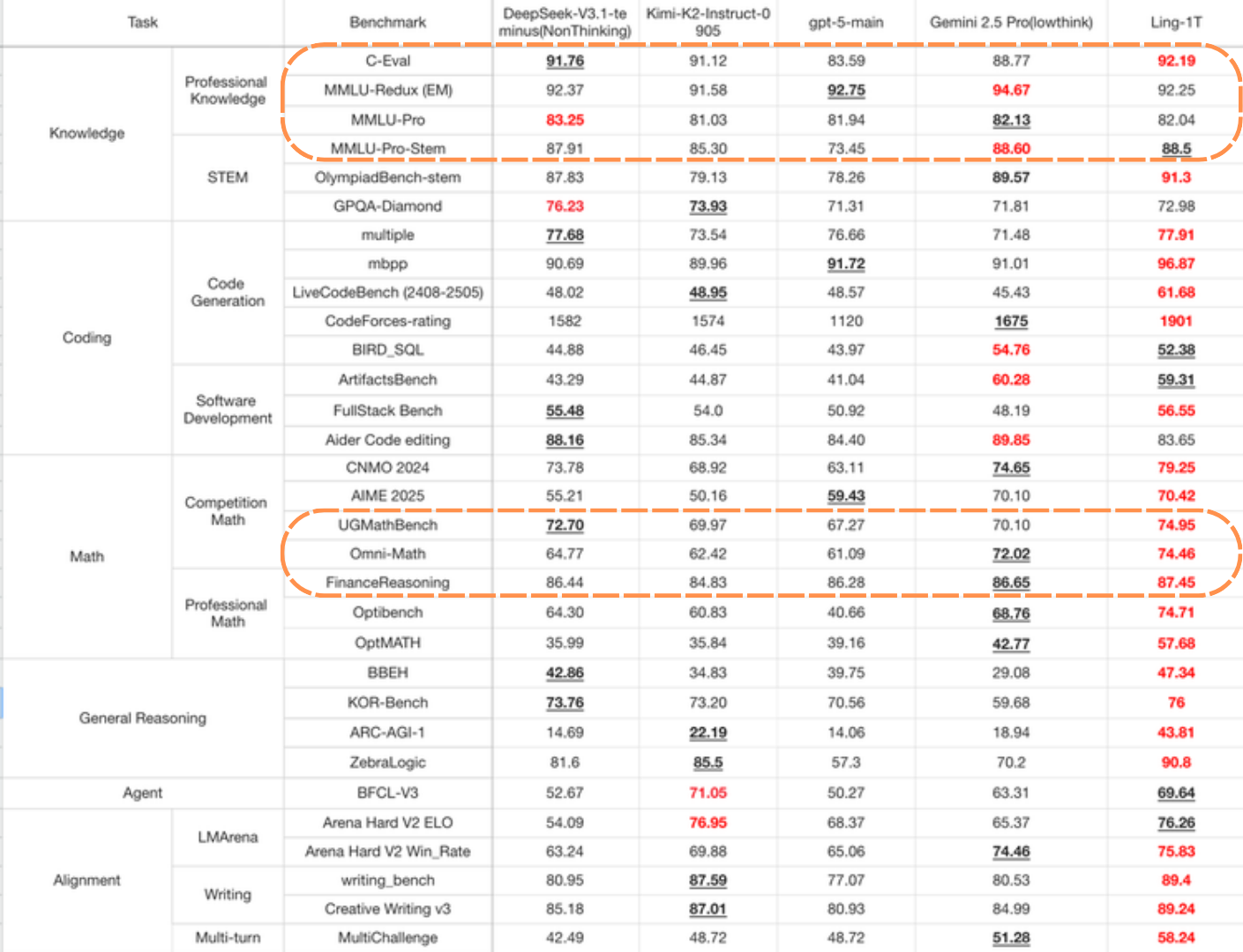 Ling-1T also excels in comprehensive reasoning and knowledge understanding.In cross-disciplinary benchmarks like Omni-Math and UGMathBench, it scored above 74 points, while achieving 87.45 in Finance Reasoning.Moreover, in leading knowledge evaluation datasets such as C-Eval, MMLU-Pro, and OlympiadBench, Ling-1T outperforms DeepSeek, Kimi, and GPT-5 by 1–3 percentage points, with some results nearly matching Gemini-2.5-Pro’s upper limits.
