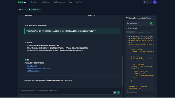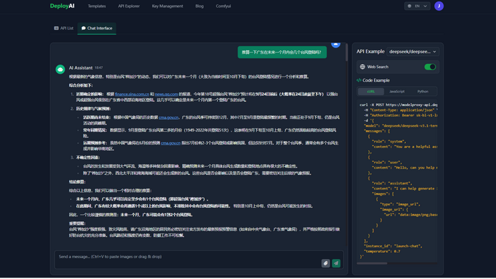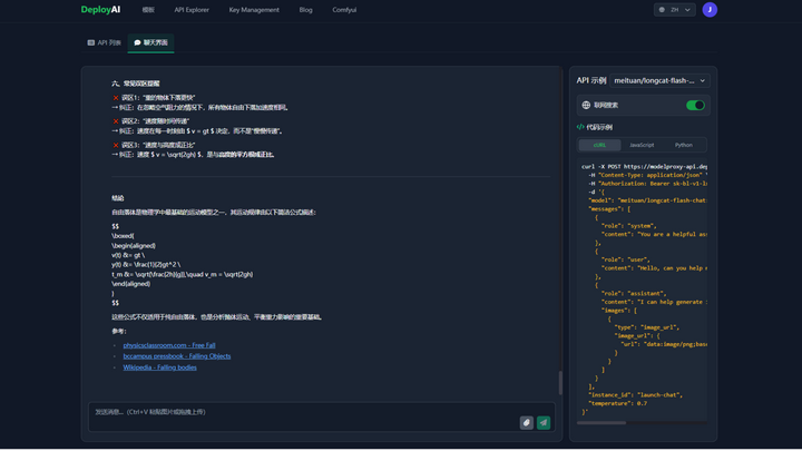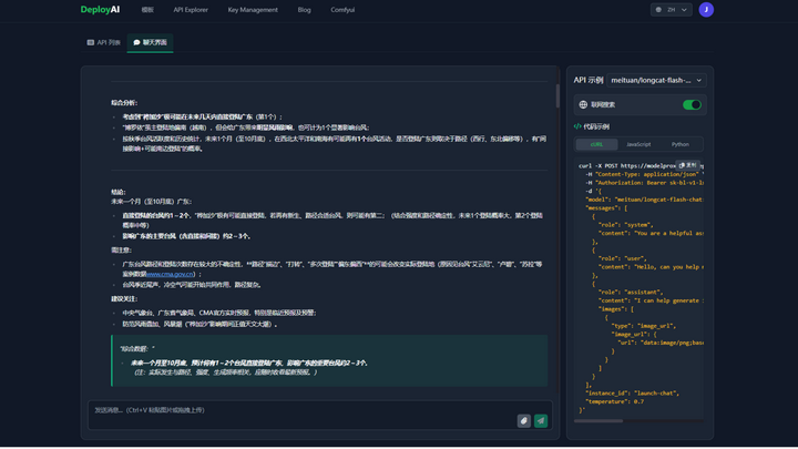 LongCat体验入口或者复制下方链接到浏览器打开https://www.deployai365.com/ApiExplorer今天从预测天气、翻译文本、物理解答的三个方面对比美团和Deepseek、Kimi2,测试他的推理能力以及他引以为傲的“快速”处理能力!1、推算一下广东在未来一个月内会几个台风登陆吗?LongCat Flash Chat耗时:19秒